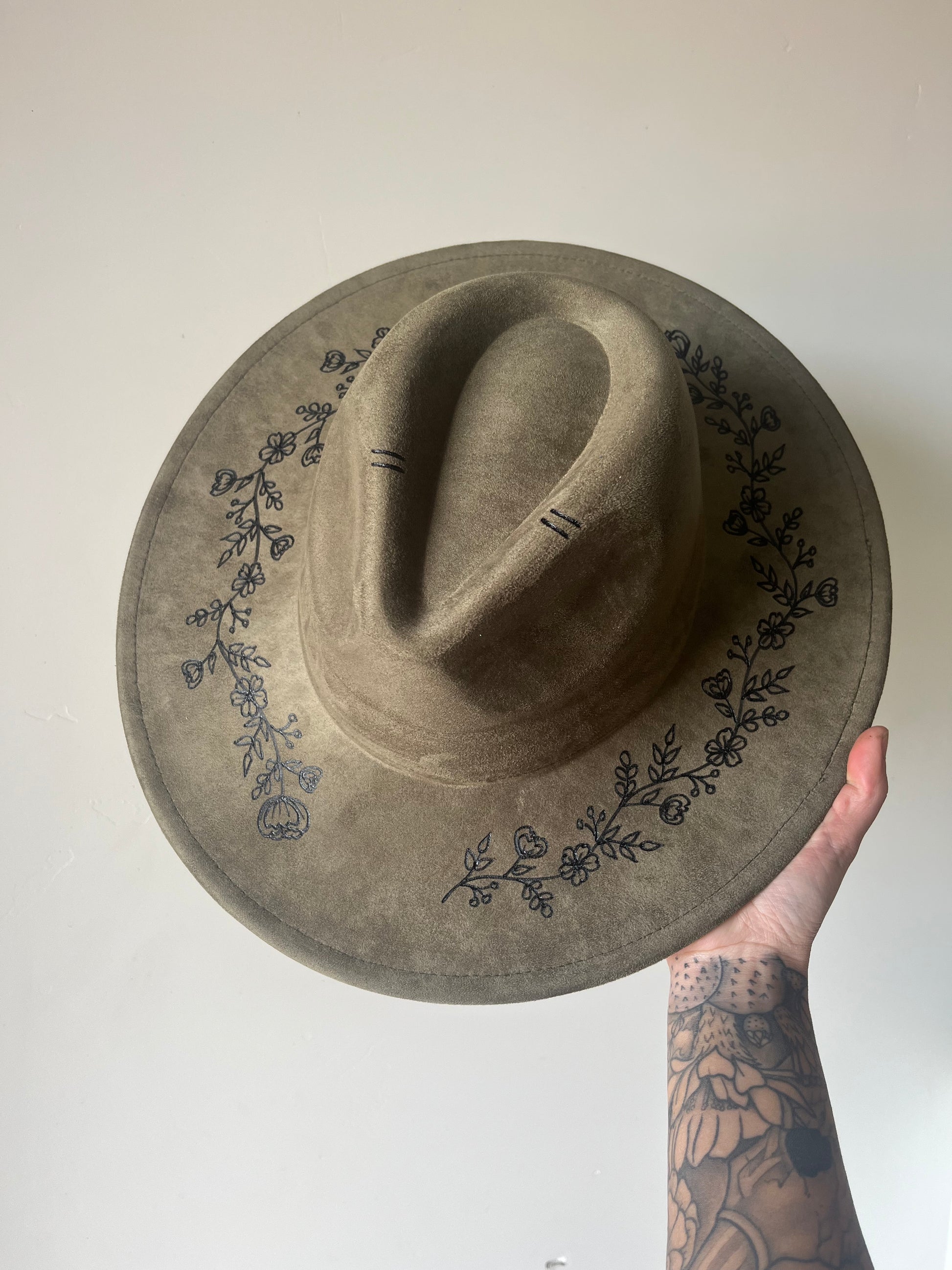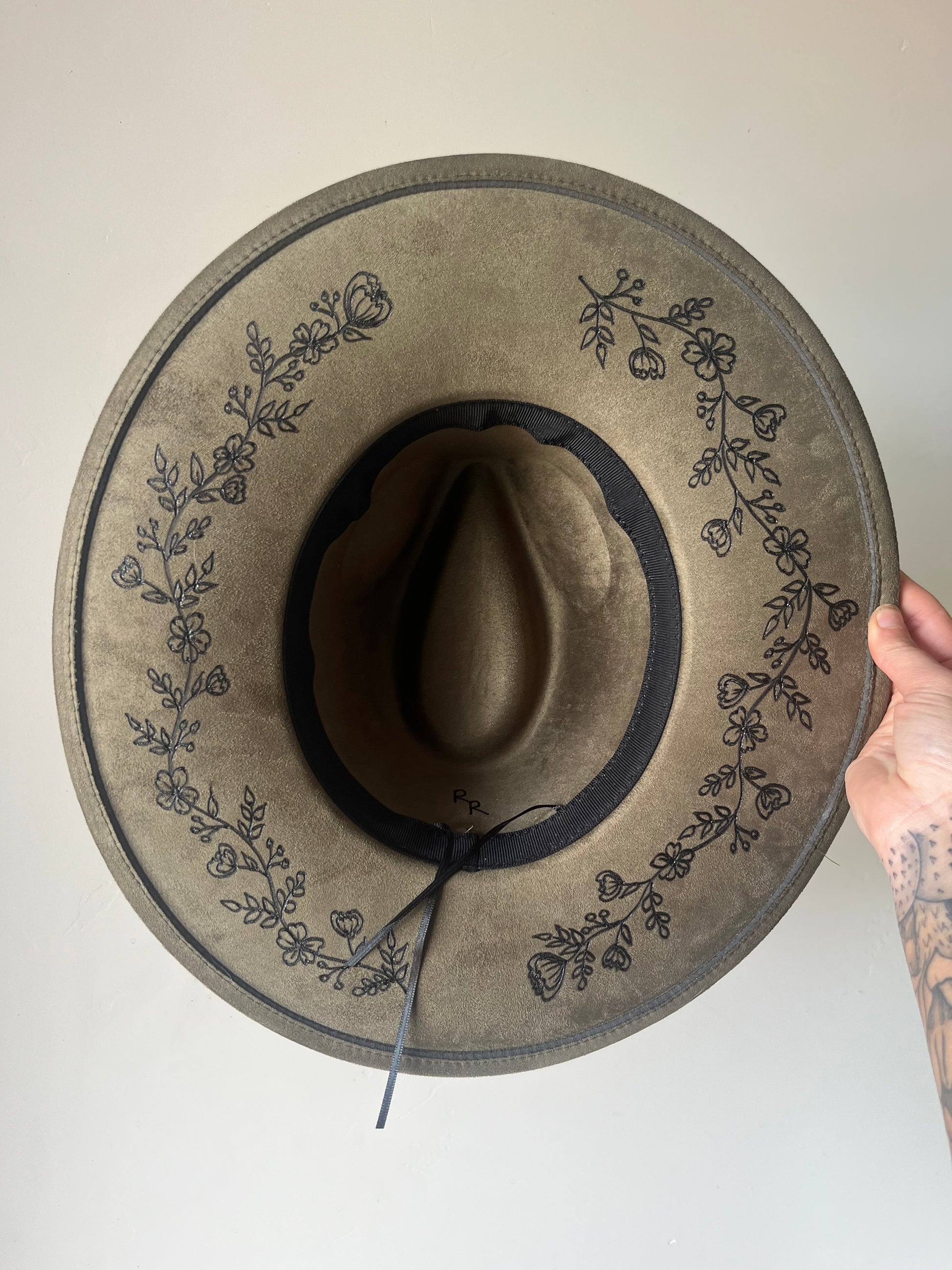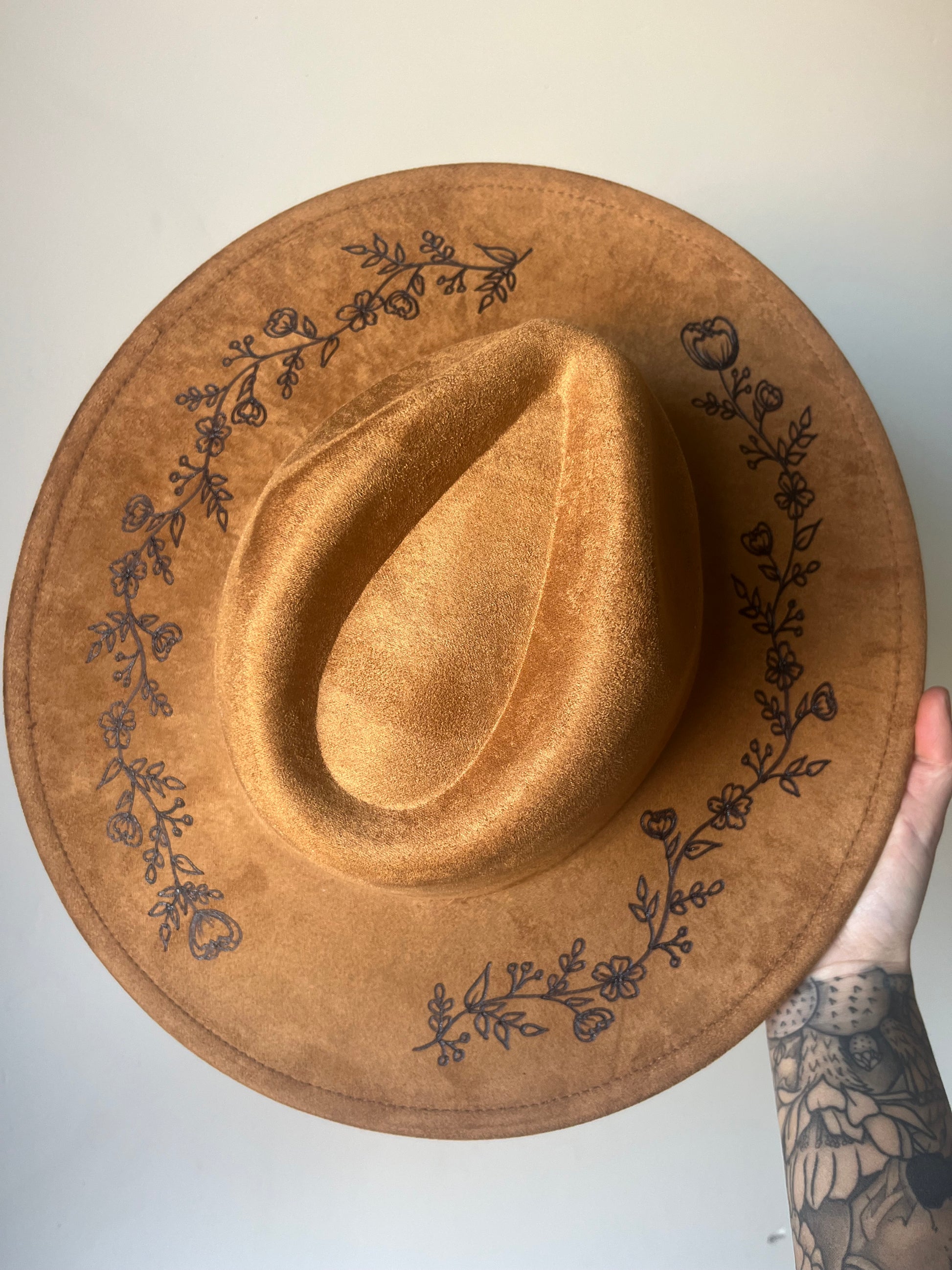 Sweet and simple floral vine design burned on your choice of color rancher hat